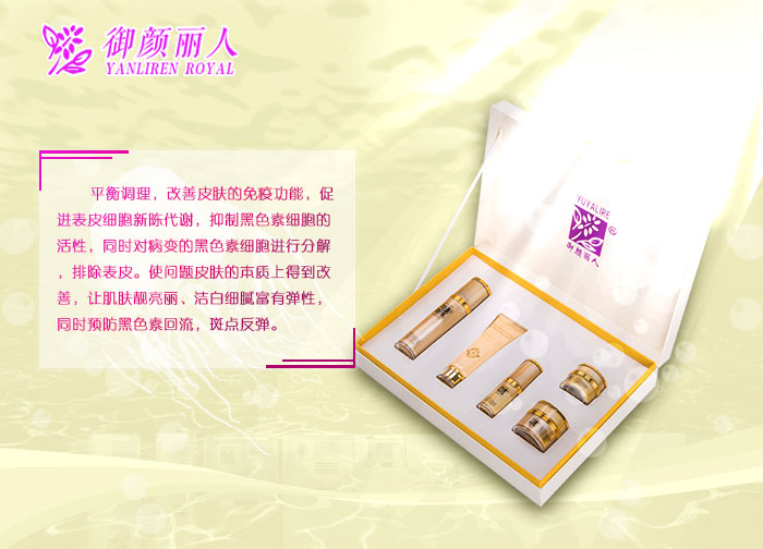 新一代御顏麗人全新上市——雪花秀系列、御方清顏五件套等產品,經過三年的時間御顏麗人以全新的理念設計出一系列高端產品終于在今年九月份全新上市,其中雪花秀系列產品更是趙總在之前的所有產品中提煉的精華可以滿足一切女性朋友實現美白,淡斑延緩皮膚的衰老,讓皮膚更玉潤、健康。