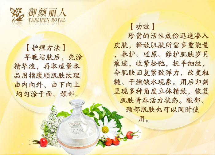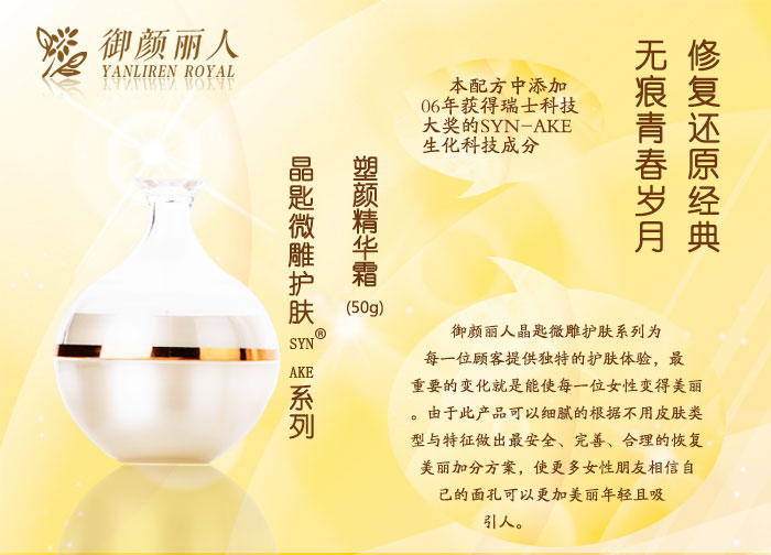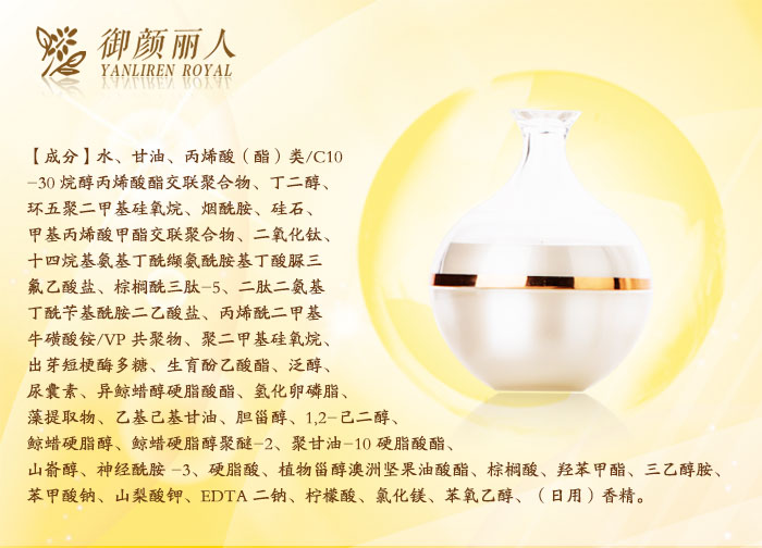 “御顏麗人”意在致力開發(fā)、設計出真正適合亞洲人,特別是中國人膚質(zhì)的護膚產(chǎn)品。“高尚生活格調(diào)源于簡約自然的保養(yǎng)”,秉承這樣的護膚理念,經(jīng)過多年的市場檢驗,證明了“御顏麗人”定位的成功,并受到了消費者的一致認可。
